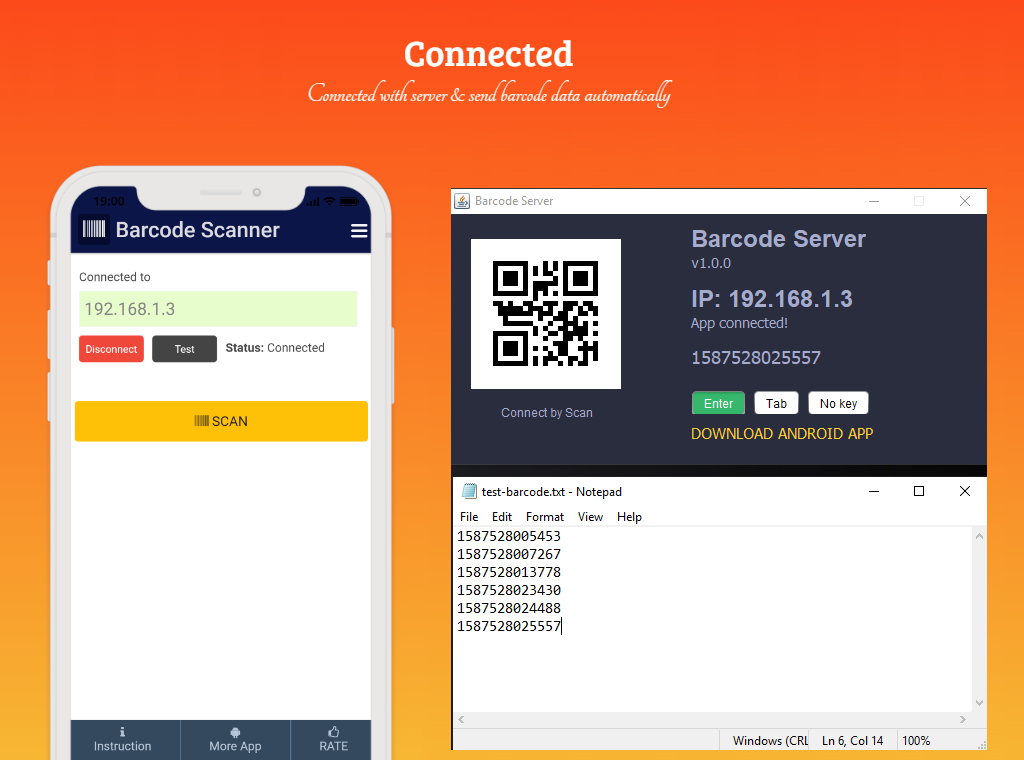 Barcode Client Server adalah penyelesaian mudah untuk mengimbas kod bar oleh telefon pintar anda dan menghantarnya dengan mudah ke PC. Anda boleh menggunakannya tanpa pelayan atau dengan pelayan kod bar untuk menghantar kod bar ke PC. Proses kerja Pelayan Pelanggan Barcode benar-benar mudah dan lurus ke hadapan.