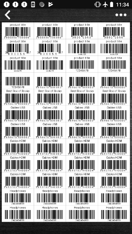 Anda boleh membuat 48 label dengan kod bar atau tajuk dan kod bar. Kod EAN dan UPC disokong sebagai Code128, Code39 dan Interleaved.