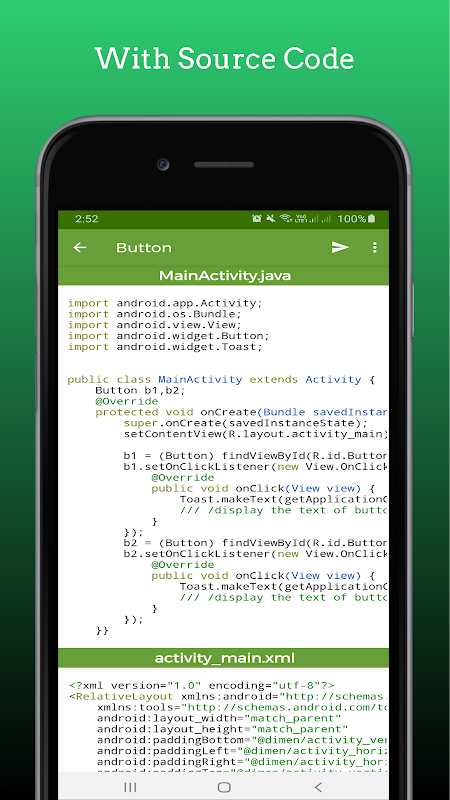 Contoh aplikasi demo berfungsi aplikasi Android ini. pembangun dapat menganalisis cara kerja contoh Android dan mengaitkannya dengan Kod Android. Semasa mengembangkan Aplikasi untuk pengguna Android, hanya perlu menyalin dan menempelkan kod dalam fail masing-masing di Android Studio. Semua contoh android dicuba dan diuji di Android Studio.
