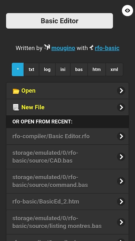 Editor Asas telah ditulis dengan RFO BASIC! untuk Android, menggunakan GW lib dan disusun dengan Android BASIC! Pengkompil.