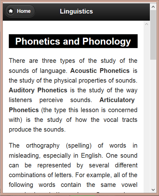 Linguistik ialah kajian saintifik bahasa. Dalam bahasa kehidupan kita adalah satu aspek penting. Semua pembangunan masyarakat manusia bergantung kepada Linguistik. Dalam aplikasi ini, kita telah diterangkan beberapa topik asas linguistik. Ini adalah Fonetik dan fonologi, morfologi, semantik dan pragmatik, bahasa kedua kaedah pengambilalihan, neurolinguistics, sosiolinguistik, sejarah linguistik, klasifikasi linguistik dan banyak lagi. Topik-topik perbincangan aplikasi ini ditulis oleh ahli bahasa yang berpengalaman. Kami cuba yang terbaik untuk membuat aplikasi ini sempurna. Jika apa-apa kesilapan boleh didapati dengan kegunaan mereka diminta untuk memberitahu pihak berkuasa kami menunjuk bahagian kesilapan itu melalui alamat mel rasmi kami.