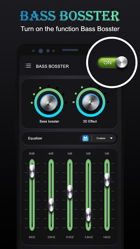 - Open "Bass Booster - Equalizer" and adjust sound level and frequency.