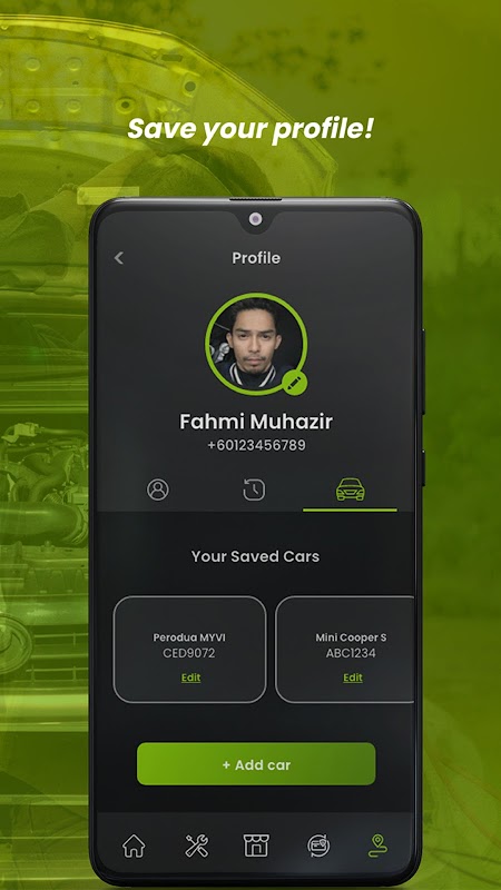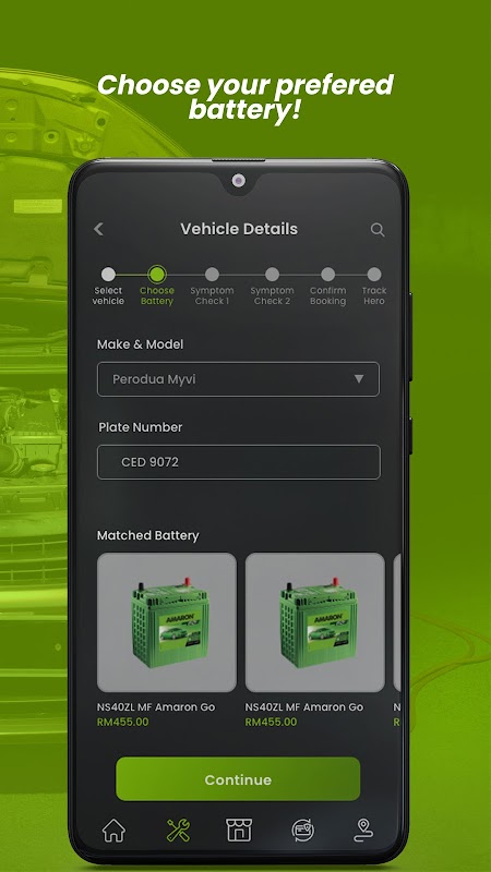 - Lancarkan aplikasi dan berikan kami maklumat kenderaan anda (model kereta dan plat nombor)