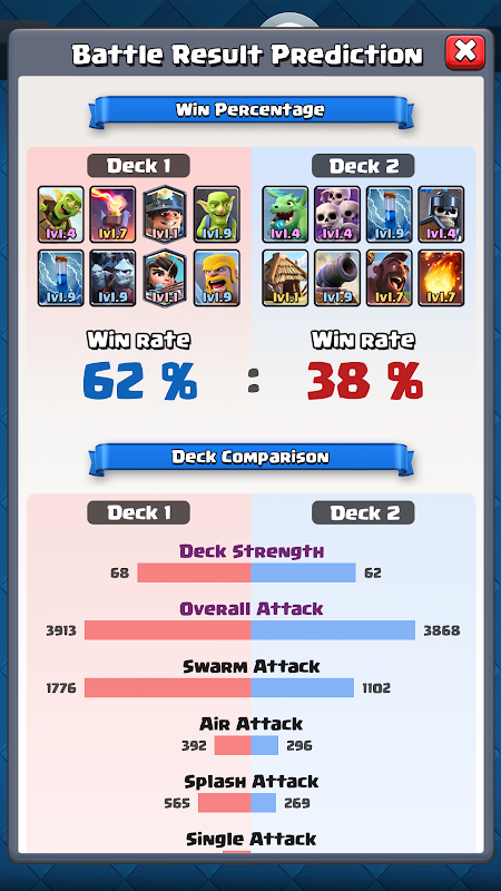Keputusan Battle Predictor (app kipas untuk Clash Royale) adalah alat pembantu yang digunakan untuk meramalkan kadar menang bagi setiap dek dalam mana-mana peperangan Clash Royale. Dengan menyediakan dua dek dan klik butang "Kira", aplikasi ini akan menganalisis dan mengira peratusan kemenangan setiap disediakan dek.