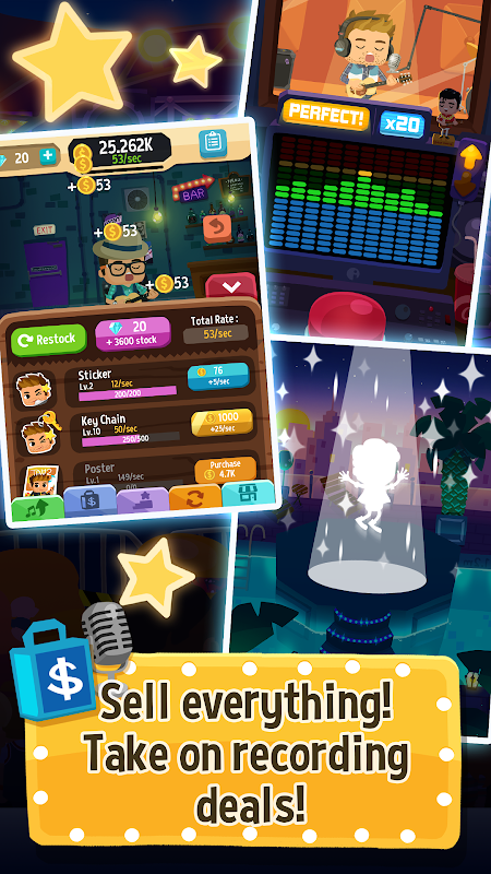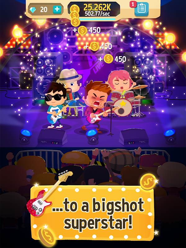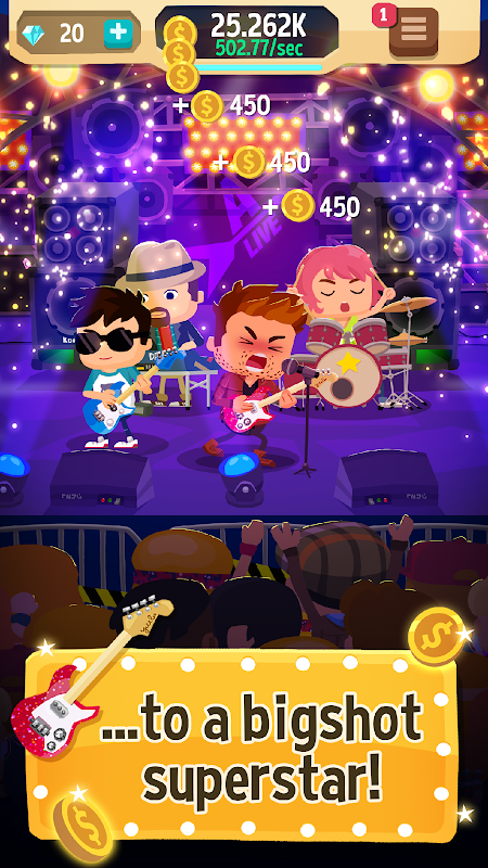 Tap to play music, collect gold, recruit band members, invest in merchandise for idle income, dazzle your fans, and travel to new gigs, each with a unique soundtrack and mood!