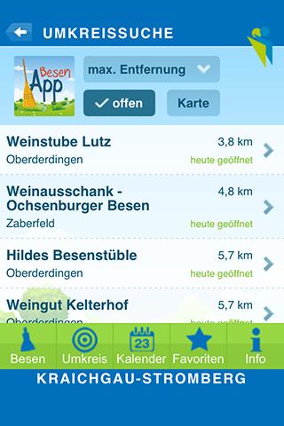 Die Besen-App des Kraichgau-Stromberg Tourismus e.V. bietet zahlreiche Informationen über lokale Besenwirtschaften, deren Adressdaten und Öffnungszeiten. Der integrierte Besenkalender informiert tagesaktuell über geöffneten Besenwirtschaften und etwaige Highlights. Die Umkreissuche sowie eine Favoriten- und Kalenderfunktion gehören ebenfalls zum Leistungsangebot der Kraichgau-Stromberg Besen App.
