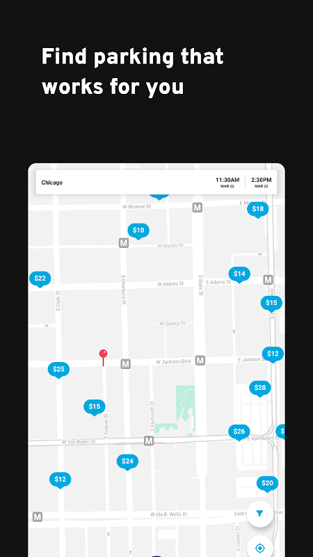 • Cari tempat letak kereta di mana dan bila anda memerlukannya. Masukkan destinasi anda melalui alamat, nama mercu tanda atau kejiranan untuk melihat ruang yang ada berdekatan.
