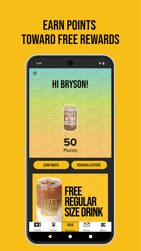 Life’s Better Buzzed… dan dengan ganjaran! Apl Better Buzz ialah cara yang mudah dan mudah untuk memesan lebih awal dan mendapatkan mata bagi minuman percuma, makanan dan banyak lagi! Lihat faedah ahli di bawah.