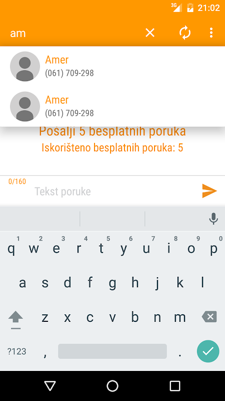 Hantar mesej kepada satu orang atau sekumpulan orang memasukkan nombor telefon atau memilih nombor dari buku telefon telefon anda. Untuk menghantar mesej teks, anda perlu memasukkan / memilih format nombor dan teks penerima nombor poruke.Podržani adalah: + 3876xxxxxxx; 003876xxxxxxx; 3876xxxxxxx; 06xxxxxxx; 6xxxxxxx;