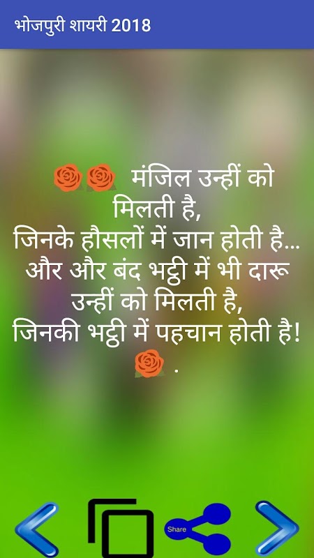 Bhojpuri language is speaking in Bihar, Uttar Pradesh mostly. But now it is world wide famous. In this Application you can read, copy and share on WhatsApp, Facebook and other social site. You will find Bhojpuri Jokes, Bhojpuri Love Shayari, Propose Shayari, Bhojpuri Sad Shayari, Bhojpuri Romance Shayari, Bhojpuri Miss You Shayari, and much more. These Bhojpuri new shayari and jokes topics are much in trending in these days. This App is easy to use and night weight. Below 10 MB. Attractive user interface. You can copy and share it on WhatsApp, Facebook and other social site or Apps.