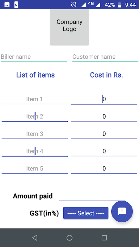 App digunakan untuk Generasi Bill. Anda boleh menambah item dan menjana invois.