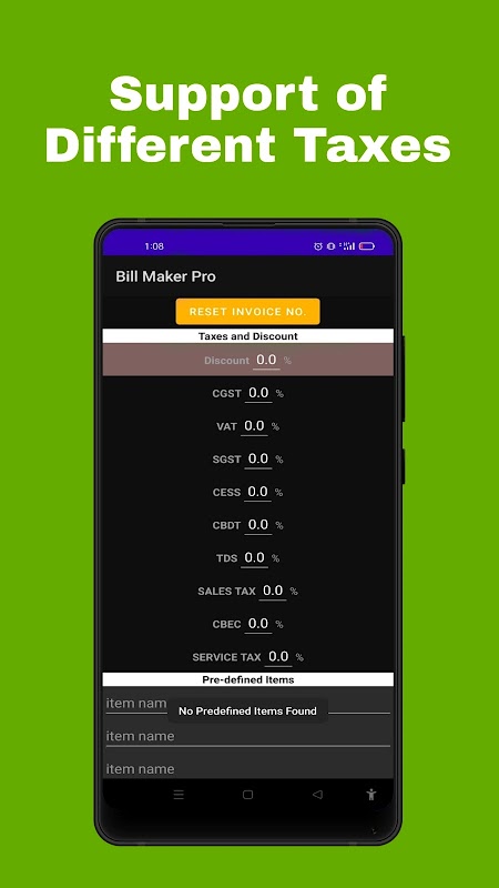 anda juga boleh memasukkan Cukai dalam Bil anda seperti CGST , SGST ,CBDT, VAT, CESS, CBEC, TDS