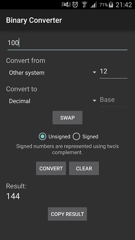 Binary Converter is a simple application that allows you to easily convert numbers between decimal, binary, hexadecimal, octal and any other positional numeral system (currently between base 2 and base 36 inclusive). This app even allows you to convert negative numbers using two's complement.