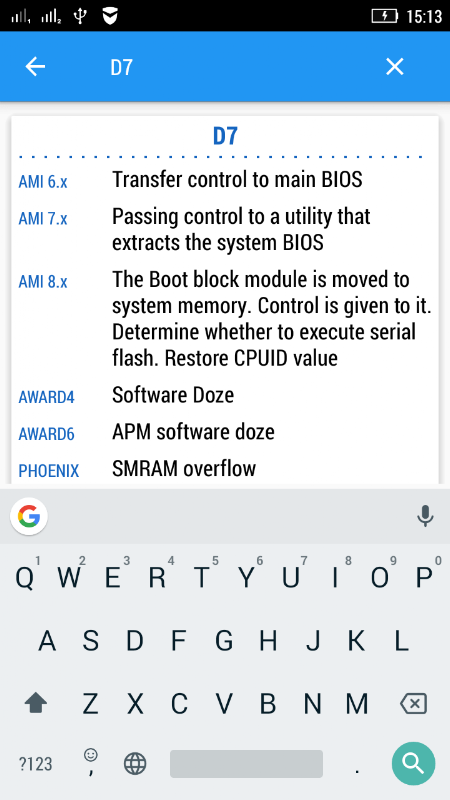 The application "BIOS POST Codes" is a handbook with a user-friendly interface for decoding BIOS error codes of modern motherboards of different manufacturers.
