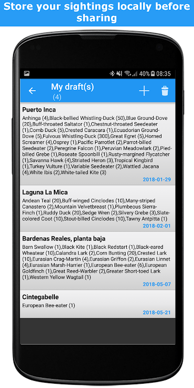 → Senarai burung yang anda lihat di tempat itu. Pangkalan data burung di seluruh dunia boleh didapati dalam bahasa Inggeris, nama Perancis dan saintifik. Anda boleh memasukkan burung dengan habis auto (menaip hanya 3 huruf dan senarai pilihan akan muncul). Anda juga boleh menggunakan Burung Notebook bagi keperluan terjemahan.