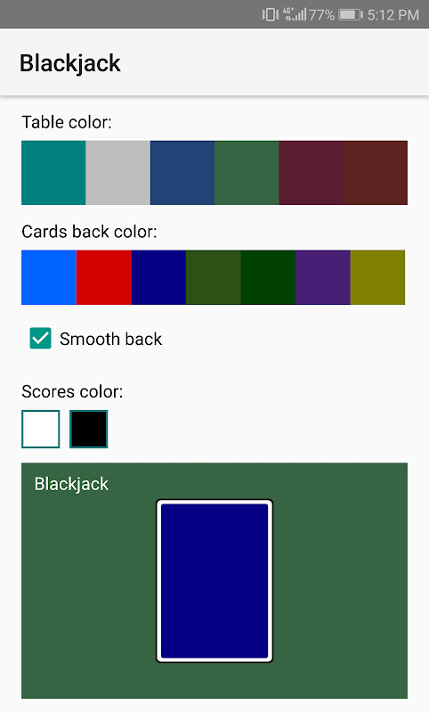 - Tetapan: Saiz kad, warna belakang kad, bunyi, animasi, kelajuan, papan skor, jadual dan skor warna ...