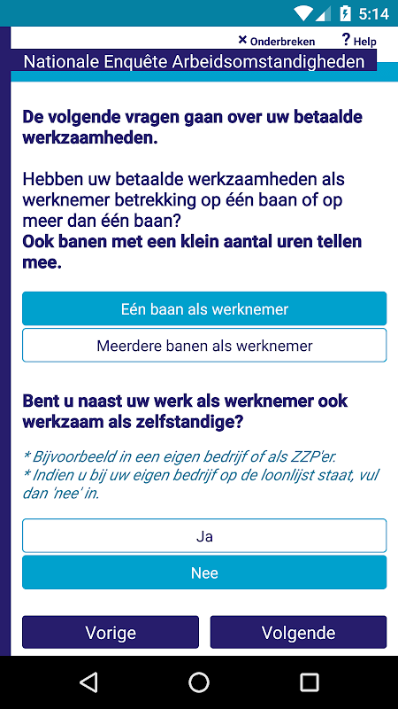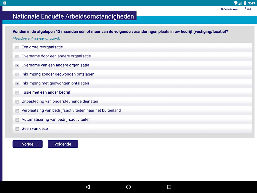 For online surveys it is required to have an internet connection during the duration of the survey, since the survey is running on a Blaise server park in this case. The app sends the answers to the questions to the server and the server calculates a response based on the given answers and the rules and checks that have been defined for the survey. The response is send back to the app and displayed to the user.