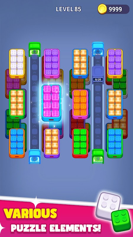 Ketik untuk mengambil blok berwarna-warni dan meletakkannya di atas penghantar. Lihat ia bergerak ke dalam peti warna yang sepadan dan isi setiap slot. Apabila peti selesai, ia akan mengosongkan ruang dan mendedahkan apa yang ada di bawahnya. Ruang penghantar adalah terhad, jadi perancangan awal adalah kunci untuk memastikan aliran bergerak dalam permainan menyusun & padan yang memuaskan ini.