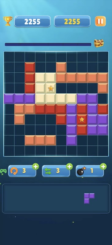 Pada permulaan permainan, kombinasi blok muncul di bahagian bawah skrin. Anda perlu menyeret dan meletakkannya pada grid atas, bertujuan untuk membentuk baris penuh. Apabila satu baris selesai, ia akan dihapuskan secara automatik dan anda memperoleh mata.