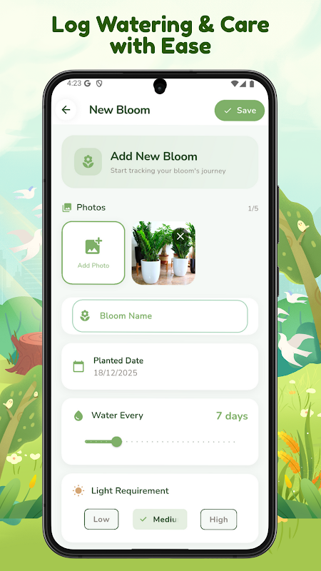 Cipta profil untuk setiap tumbuhan dengan tarikh penanaman, jenis tanah, keperluan cahaya, nota dan foto. Edit atau alih keluar entri pada bila-bila masa, dengan kawalan penuh ke atas data anda.