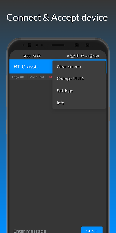 Aplikasi ini membolehkan anda mengimbas, menyambung & berkomunikasi dengan peranti Bluetooth lain.