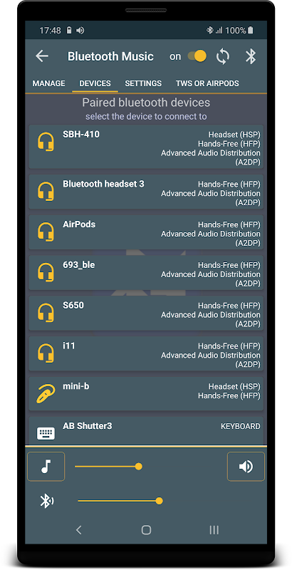 Aplikasi ini serasi dengan kebanyakan peranti audio Bluetooth (pembesar suara, alat dengar, peranti pendengaran, ...) AirPods, Beats, JBL, Sony, Taotronics, Mpow, Anker, Xiaomi, Philips, Soundpeats, Huawei, Aukey, Bts, Qcy, Sbs , Apple, Jabra, Oneplus, Amazon, Tws, Bluedio, Soundcore, Powerbeats, TWS i11, i12, i30, i90, i200, i500