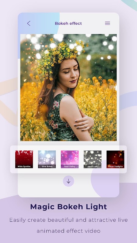 Do you want an easy way to add the famous bokeh light effect to your images? Or would you simply like to add filters like the famous heart effect, glitter effect or flower crown filter on top of each other to your image? or Wanna make lovable animated picture? Then just go for it. Download this bokeh light photo effect video maker app and create your best photo to video with amazing animation effects & magic filters! Bokeh effects video maker is a wonderful app that you can choose your favorite love bokeh effect overlay and blend effect to your photo.