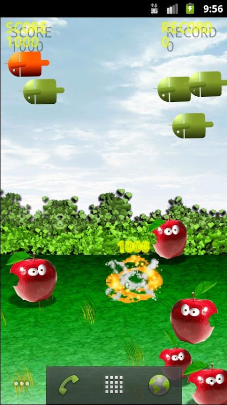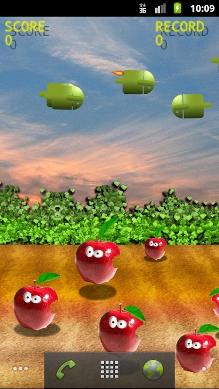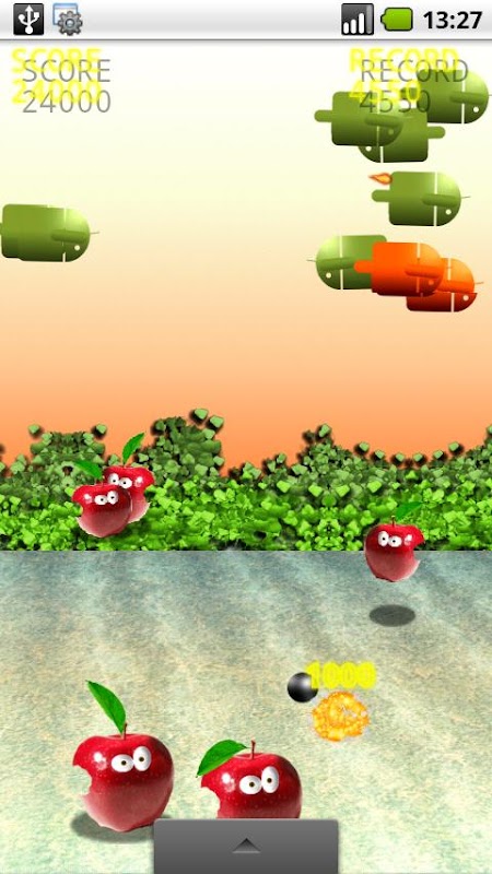 Tap the Droid to drop the bomb and try to shoot the jumping apples.
