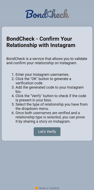BondCheck ialah perkhidmatan yang membolehkan anda mengesahkan dan mengesahkan hubungan anda di platform sosial.