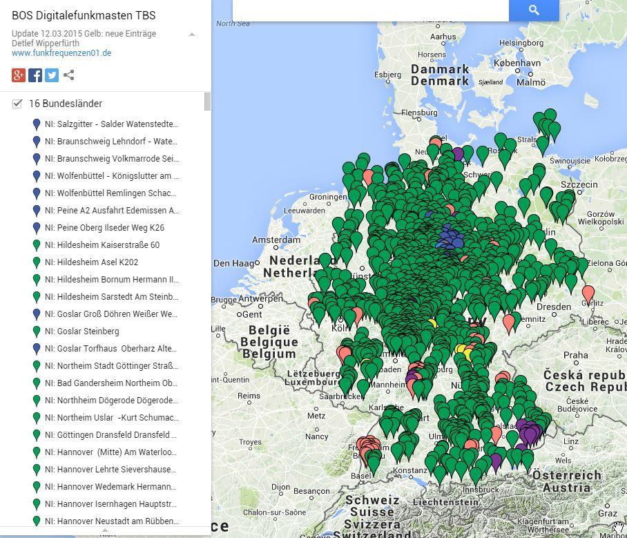 Die App zeigt eine Karte mit den BOS Digitalefunkmasten TBS in Deutschland an.