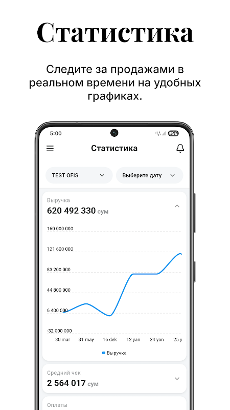 Permohonan untuk pemilik perniagaan, di mana anda boleh melihat laporan jualan utama dan maklumat terperinci tentang resit di pertubuhan anda dalam bentuk graf yang jelas dan mudah. Data datang terus daripada sistem automasi (cloud cash register) Pospoint, supaya anda sentiasa mempunyai akses kepada maklumat terkini.