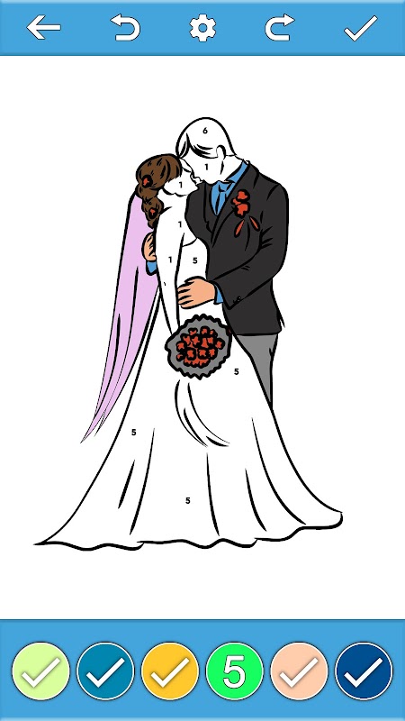 Selamat datang ke Pengantin & Pengantin Lelaki Mewarna Mengikut Nombor, pengalaman mewarna terbaik untuk mereka yang mencari percintaan, kreativiti dan kelonggaran yang menggembirakan! Dengan pelbagai jenis gambar yang menarik dan pelbagai mod pewarna termasuk Pepejal, Kilauan, Krayon dan Cat Minyak, permainan ini menawarkan kelainan unik pada buku pewarna tradisional.