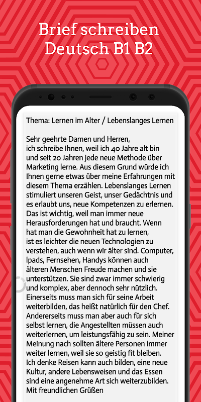 Diese App wird Ihnen bei der B2-Prüfung sehr helfen. Deutsch ist eine der logischsten Sprachen, diese App gibt Ihnen eine gute Vorstellung davon, wie man Briefe schreibt. Wenn Sie Brief schreiben Deutsch a1, Brief schreiben Deutsch a2, Brief schreiben Deutsch b2 gelernt haben, wird Ihnen diese Anwendung sehr helfen.