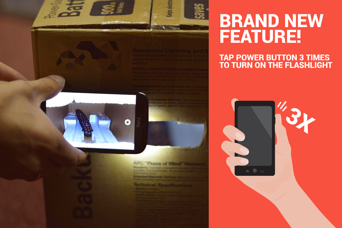 lampu suluh yang mudah dan boleh dipercayai dengan reka bentuk yang baik dan ciri-ciri berguna. Tekan butang besar untuk menghidupkan obor / mati. Tekan butang kamera kecil untuk mengaktifkan kamera belakang, ia adalah satu penyelesaian yang mudah untuk tempat-tempat yang tidak mudah didekati.