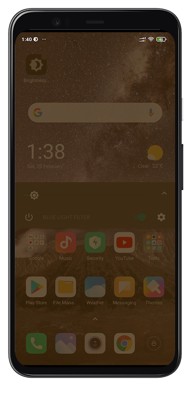 Ia membantu untuk mengelakkan sakit kepala dan sakit mata dalam persekitaran yang gelap atau pada app night.This juga membolehkan anda untuk menyesuaikan penapis untuk menukar warna penapis.