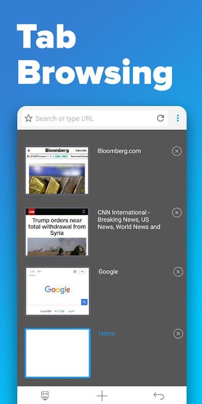 Super fast browsing speed, Tab function, Your favorite websites available in one click, Constant and modern updates, Full privacy