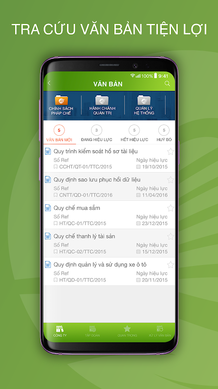 - Văn bản lập quy: tổng hợp và quản lý các văn bản lập quy của công ty và tập đoàn.