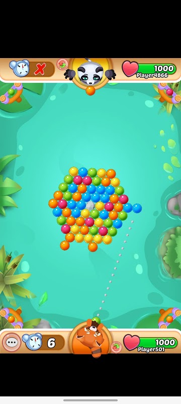 The bubbles are stacked at center of arena and you take turn shooting them down