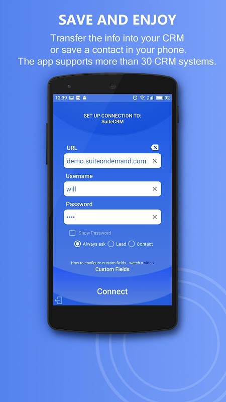 Business Card Reader Multi CRM ialah penyelesaian termudah, terpantas dan selamat untuk memindahkan maklumat daripada kad perniagaan kertas ke dalam sistem CRM menggunakan kamera telefon pintar anda. Ambil gambar kad perniagaan dan aplikasi akan mengimbas dan serta-merta mengeksport semua data kad terus ke CRM anda. Selain itu, aplikasi ini akan membantu anda mengetahui lebih lanjut tentang bakal pelanggan, rakan kongsi atau rakan sekerja. Ia adalah salah satu aplikasi terbaik untuk sistem CRM.