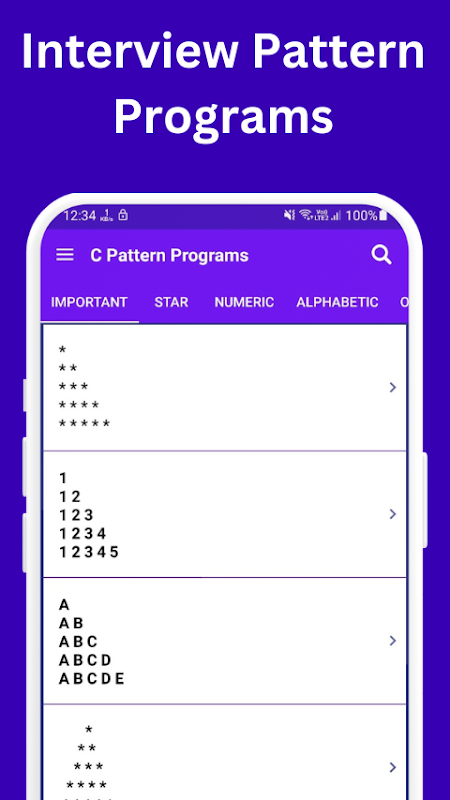 Program Percetakan Corak: Apl ini menawarkan pelbagai program pencetakan corak yang membantu pengguna memahami logik dan struktur yang diperlukan untuk mencipta corak yang menakjubkan menggunakan pengaturcaraan C.