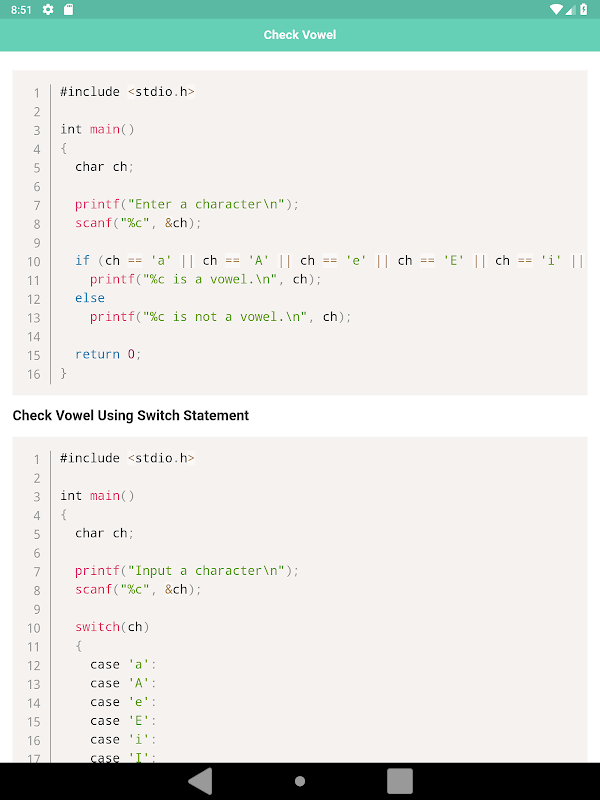 Aplikasi ini mengandungi contoh kepada konsep-konsep asas pengaturcaraan C seperti gelung, fungsi, petunjuk, struktur, Susun, Search, String, operasi fail dan lain-lain Kod seperti Cetak Integer, Penambahan, Ganjil atau Malah, Tambah, tolak, darab dan bahagi dan lain-lain