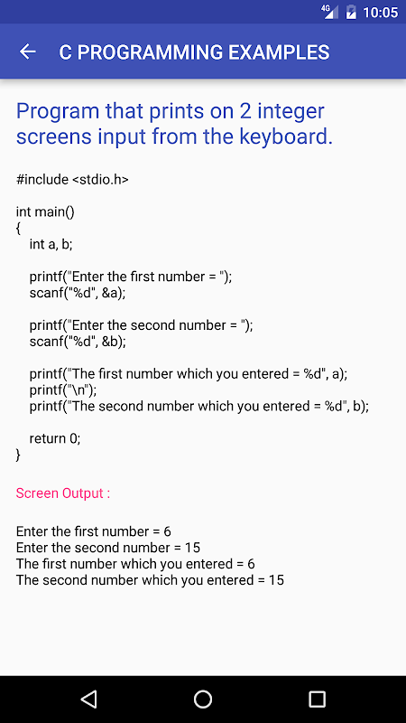 C PROGRAMMING SAMPLES is an application which is composed of C examples for those who are new to C language and those who want to improve themselves with examples. The application is separated by C subjects, many examples of each topic are available and this number will increase with new samples. Each sample screen output is absolutely available, you can experiment by yourself and check out the application from the screen. In practice, if you have a problem, wish, suggestion or something you see wrong, you can send an e-mail from "contact us" and an absolute return will be made. Application developers are university students, you can support by clicking on the ads. Optionally, the application will be developed for different software languages.