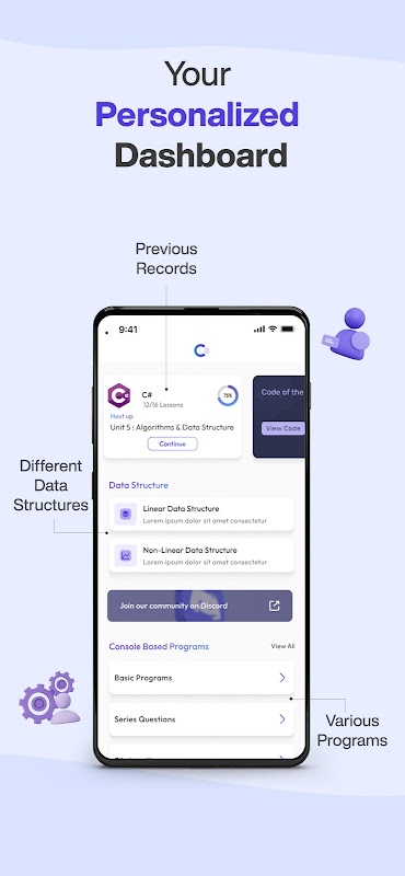 Ia mengandungi pelajaran interaktif, latihan, kod, kuiz dengan penjelasan.