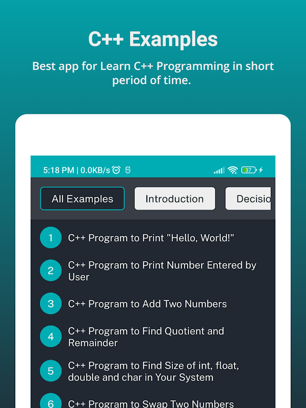 Mempelajari Bahasa Pengaturcaraan C++ menggunakan senaman ialah cara mudah untuk mempelajari pengaturcaraan dengan cepat. Dalam apl ini, setiap topik mengandungi contoh sendiri dengan output yang unik.
