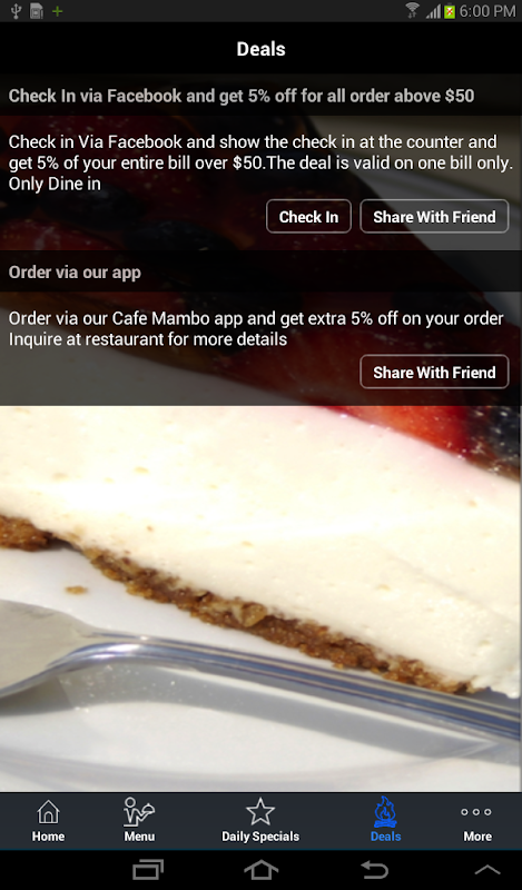 Use Cafe Mambo for Online Ordering, Table booking, Deals, Loyalty and other features like social sharing, call us, locate us, etc.