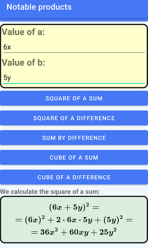 The application shows the develpment of the notable identities, doing the operations step by step. The user can also see the formulae of the notable identities.