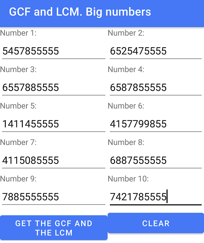 Application to calculate the Greatest Common Factor (GCF) and the Least Common Multiple (LCM) of several numbers (from 2 to 10 numbers). Each number can have ten digits.
