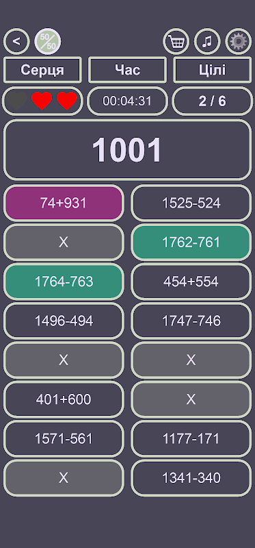 Di setiap peringkat akan dibentangkan jumlah sasaran, jumlah yang perlu ditentukan daripada pilihan yang dibentangkan di 12 sel-sel. Tidak menguap, untuk semua ini adalah pasti masa. Juga anda hanya mempunyai 3 hak untuk membuat kesilapan.