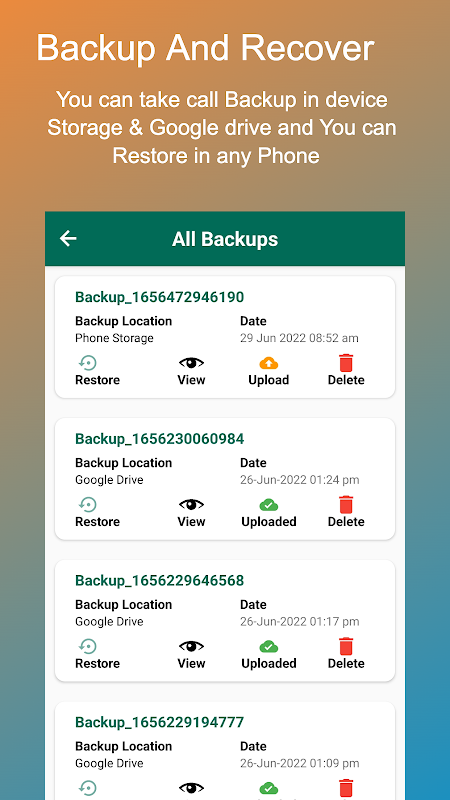 mulakan data sandaran panggilan secara harian, mingguan dan bulanan. Sandaran tidak pernah kehilangan data panggilan anda. Cally menyediakan cara mudah untuk mengambil Sandaran dan Pulih Sejarah Panggilan.