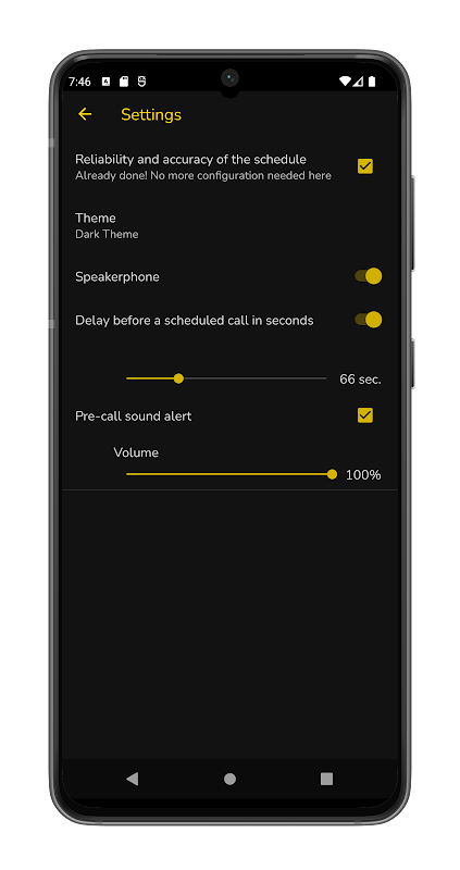 Dalam tetapan aplikasi, anda boleh menetapkan kelewatan sebelum panggilan, serta mendayakan amaran sebelum panggilan bermula. Dalam kes ini, program akan memberi isyarat, dan anda boleh membatalkan panggilan jika anda mengubah fikiran anda.